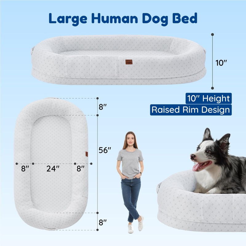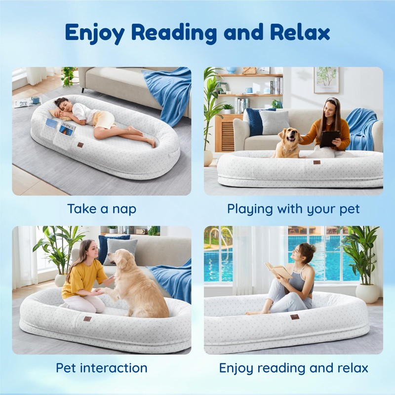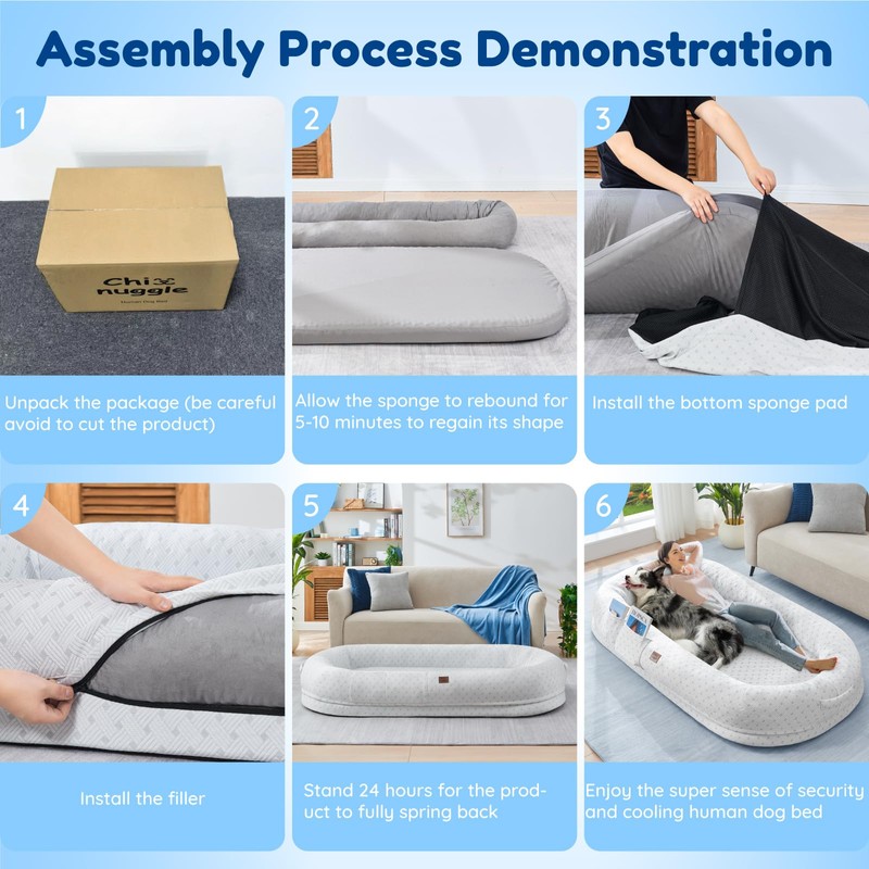 • Wash & Care: Simply unzip, remove filler, and machine wash the bed cover. Important Notice: Our human dog bed is vacuum-compressed for shipping. After completing the installation, please allow a minimum of 24 hours for the bed to regain its shape.