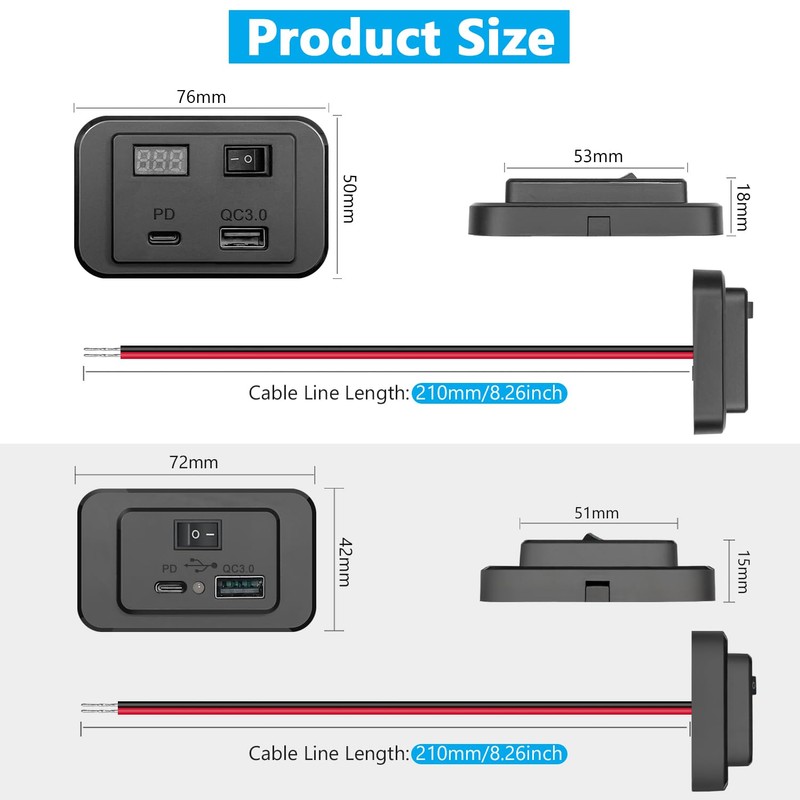 • PD+QC3.0-Port-Schnellladesteckdose mit blauer LED-Spannungsanzeige. Spannungsanzeigebereich: DC8V bis 30V.Überwachen Sie die Bordspannung, um Verluste zu reduzieren und die Lebensdauer des Geräts zu verlängern.