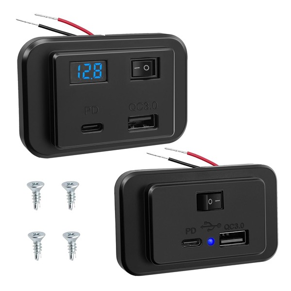 Giantdeer 2PCS 12V Auto Ladegerät Ladebuchse Panel mit LED Voltmeter und Schalter, 40W USB C Steckdose 12V Wohnmobil, PD Type C+QC3.0 USB Schnellladung Steckdose Panel für 12V-26V Auto/Wohnmobil/Boot