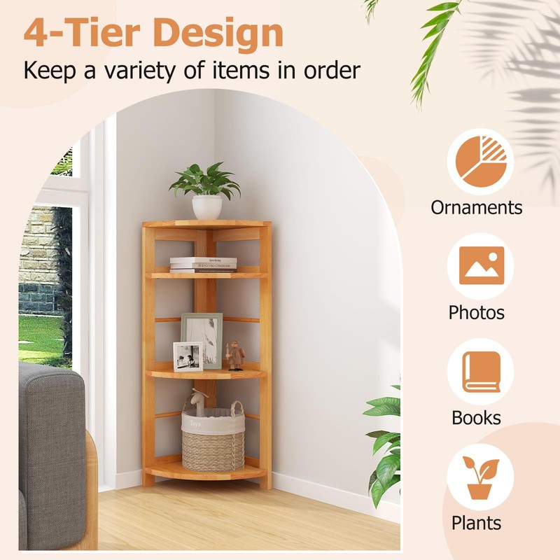 Giantex 4-Tier Corner Shelf, 34" Bookshelf with Rubber Wood Frame, Anti-Toppling Kit, Freestanding Storage Shelf, Corner Display Rack Plant Stand for Living Room, Study, Bedroom, Home, Natural