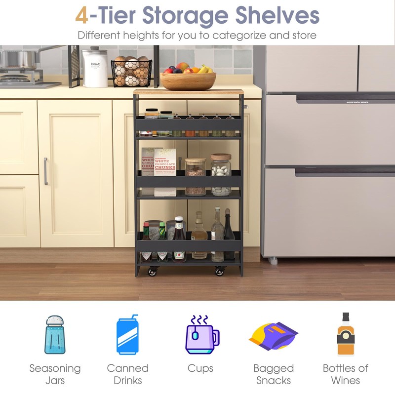 • [Sufficient Storage Space]: Provide dedicated spaces on shelves of different heights with guardrails to prevent spills. This 4-tier cart accommodates items of varied heights such as cans, condiments, and drinks, promoting smart organization.