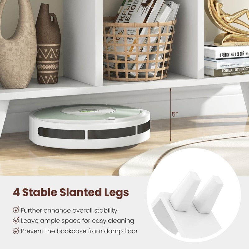 - [Sturdy Legs for Stability]: The bookshelf is equipped with 4 stable slanted legs to enhance overall stability and prevent wobbling. Raised 5" off the ground, it avoids contact with damp floors and allows for easy cleaning with a robot vacuum.