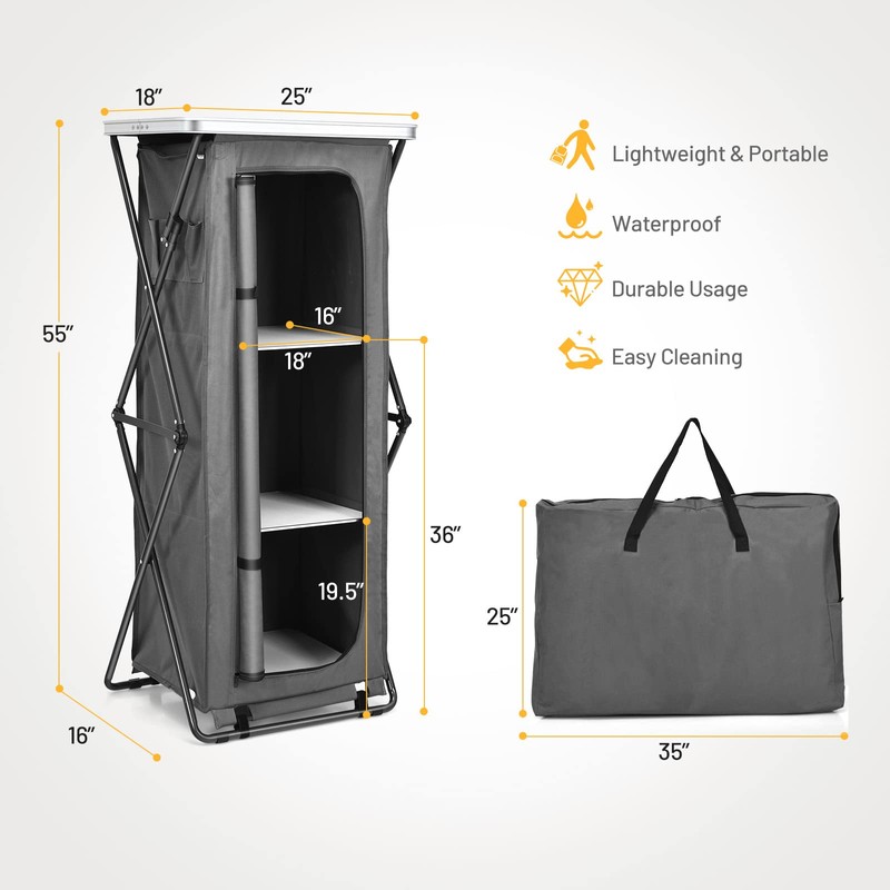 - 【Portable Camping Storage Cabinet】: This pop-up cupboard can be folded into a compact size for easy storage. It also comes with a carrying bag. Perfect for outdoor barbecues, party, camping, picnics, backyards and tailgating.