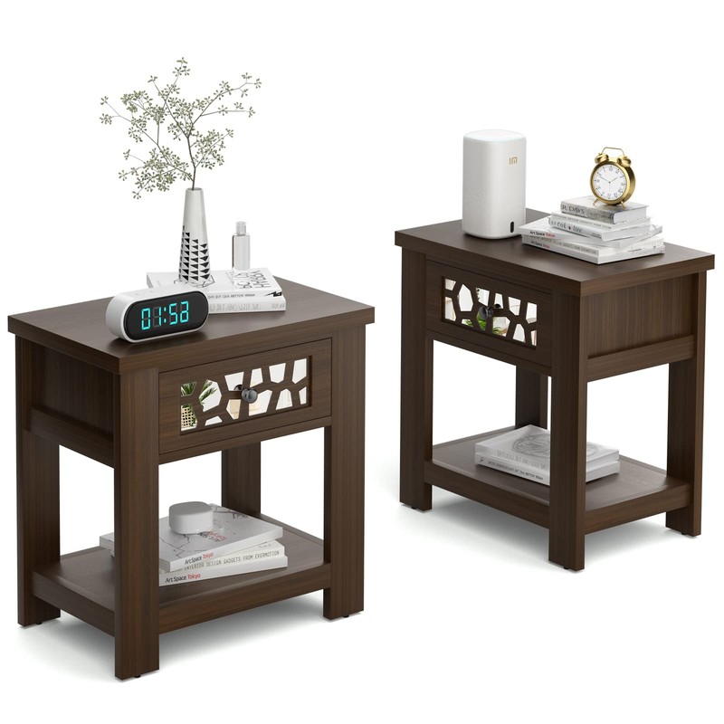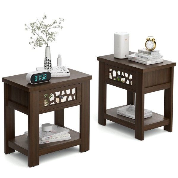 Giantex Mirrored Nightstand Set of 2, Retro End Table with Mirror Front Drawer and Open Storage Shelf, 2-Tier Wood Bedside Table, Small Side Table Accent Table for Living Room, Bedroom, Brown