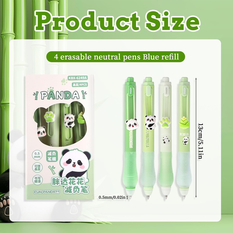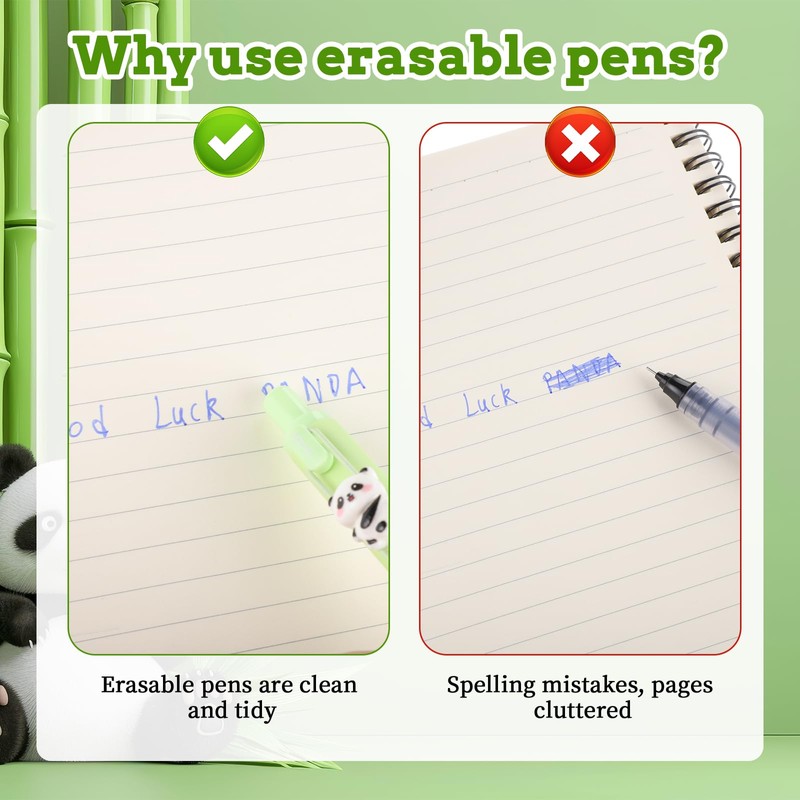 - 【Packaging Includes】Erasable gel pen set contains 4 pens Each pen features a cute panda-shaped eraser, allowing you to correct mistakes anytime, anywhere. These cute erasable pens are perfect for kids and adults alike, adding fun and functionality to your writing tasks.
