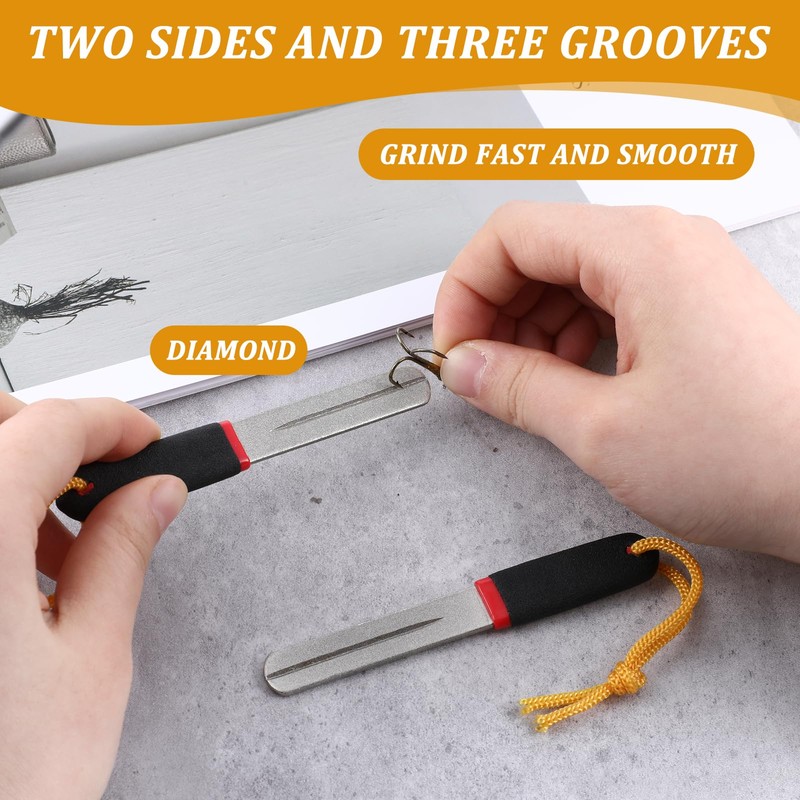 - EFFECTIVE SHARPENING The double sided hook sharpener allows for effortless and effective sharpening of your fishing hooks. With fine-grained grooves on one side and medium grain grooves on the other, you can sharpen your hooks as needed, increasing catching efficiency