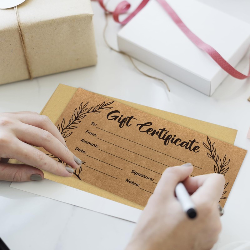 - 🏆 IMPRESS RECIPIENTS. Use these unique and elegant kraft paper gift cards to leave a deep impression on customers. Use them as promotional certificates, business gifts for clients or holiday gift certificates for business.