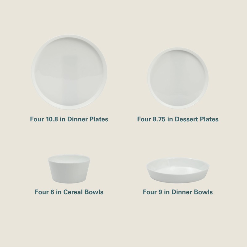 - A COMPLETE SET INCLUDES: Four 10.8-inch dinner plates, four 8.75-inch dessert plates, four 9-inch dinner bowls and four 6-inch cereal bowls
