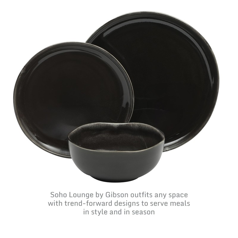 Gibson Soho Lounge Nardini 12 Piece (Service for 4) Plates and Bowls Reactive Glaze Dishes Stoneware Ceramic Dinnerware Set - Black