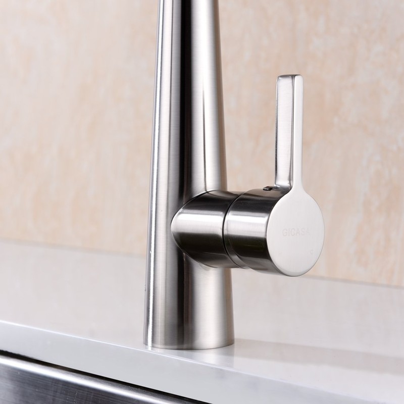 - GICASA kitchen faucet is constructed by all brass material, not zinc alloy, lead free, superior corrosion and rust resistant. Kitchen faucet brushed nickel finish resists water spots and fingerprints, looking clean and beautiful.