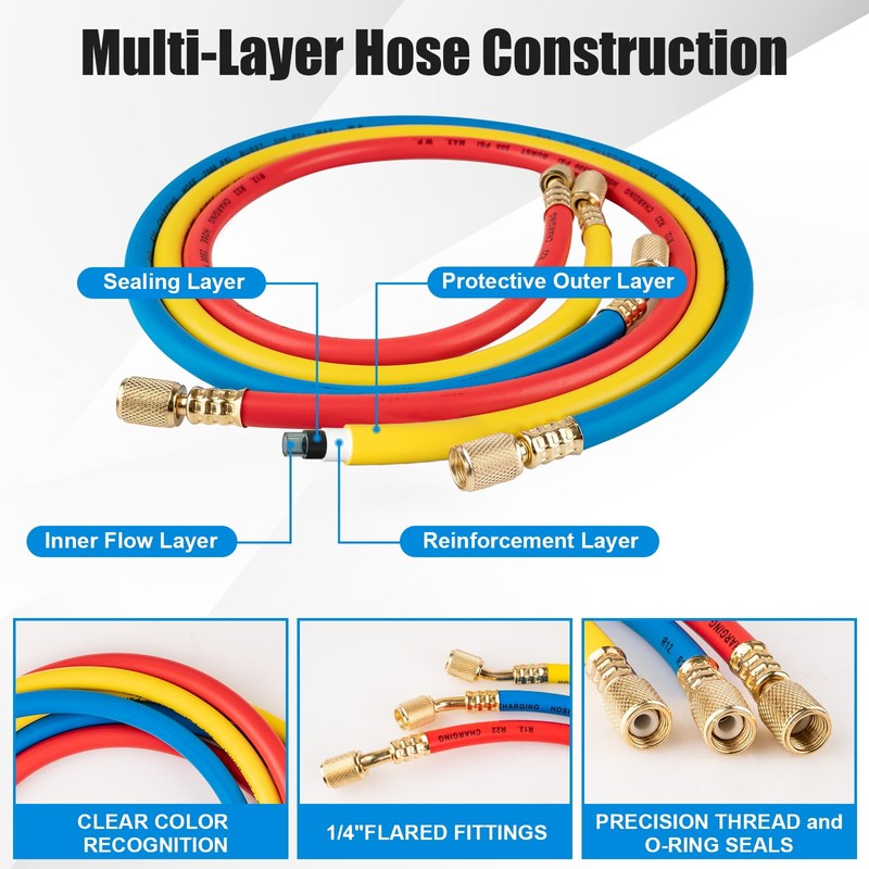 - Reinforced Hoses with Color-Coded Design: Equipped with three 3FT PVC hoses (red for high, blue for low, yellow for charging), each designed to handle up to 600 PSI working pressure and 3000 PSI burst pressure. Reinforced 4-layer construction provides excellent durability and flexibility in any AC servicing condition