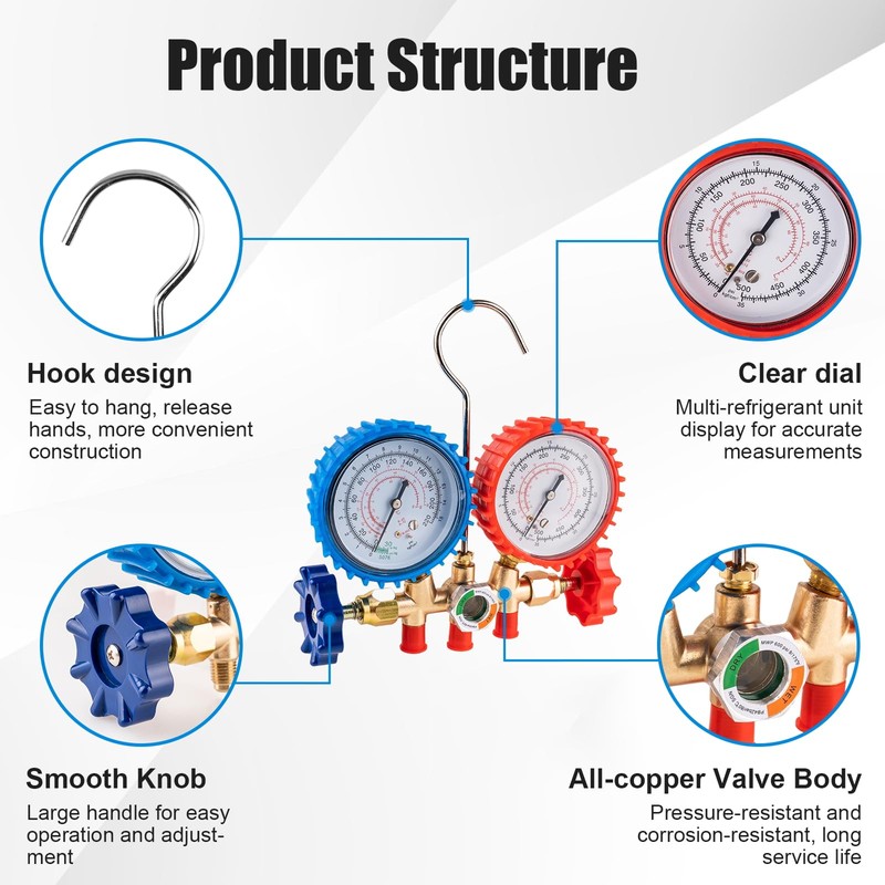 - Reliable Construction: Constructed from solid brass and high-strength aluminum alloy, this ac gauge set is designed to resist corrosion and wear. The reinforced threaded connectors and fittings ensure a leak-free seal and years of dependable service in automotive or home environments