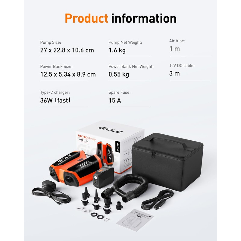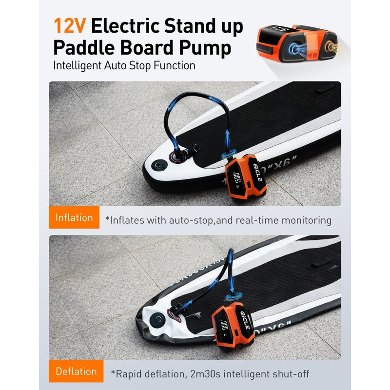 GICLE 51.2Wh Rechargeable Paddle Board Pump, 22PSI Portable Battery Powered Sup Pump with Dual Stage Inflation&Auto-Off Deflation, DC 12V /Type-C Input for The Paddleboard, Boat, Tent, Kayak