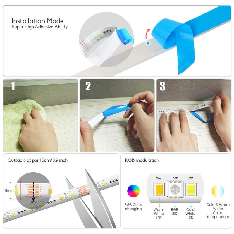- 💡RGB Warm White Cold White color led strips Cuttable and Linkable, Flexible Light Strip can be cuttable at every 3.9inch(10cm) without damaging the rest strips, can be shorten, lengthen or bend it freely.Reconnection requires a 6pin LED connector. Lightstrip width 12mm.