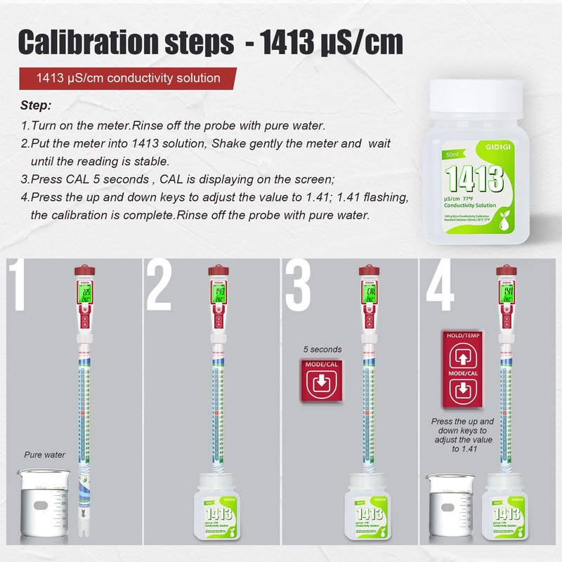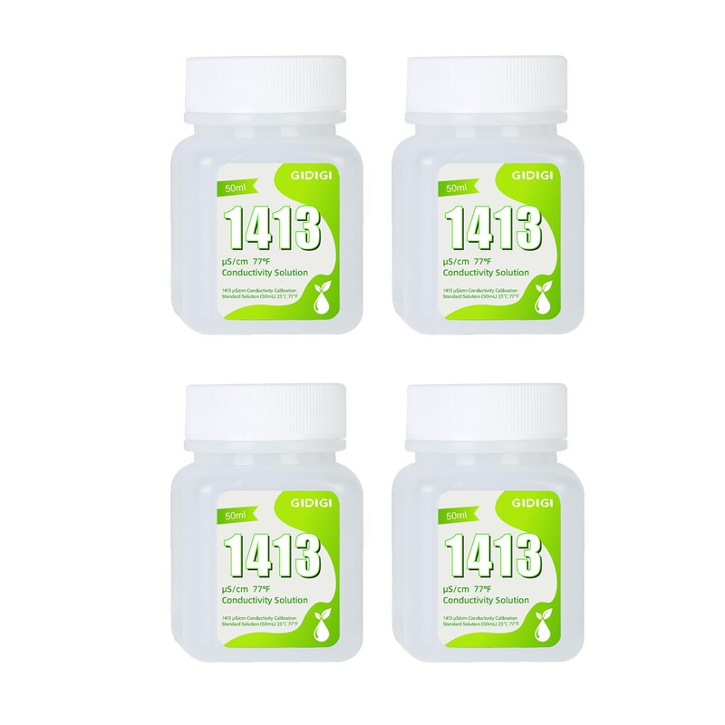 - ★ GIDIGI 1413μS/cm Calibration Solution kit includes 4 Bottles of 50mL, which is easy to store and use, just put the electrode into the calibration solution and calibrate.