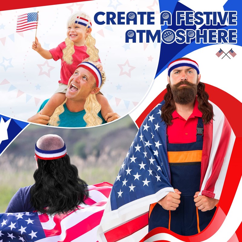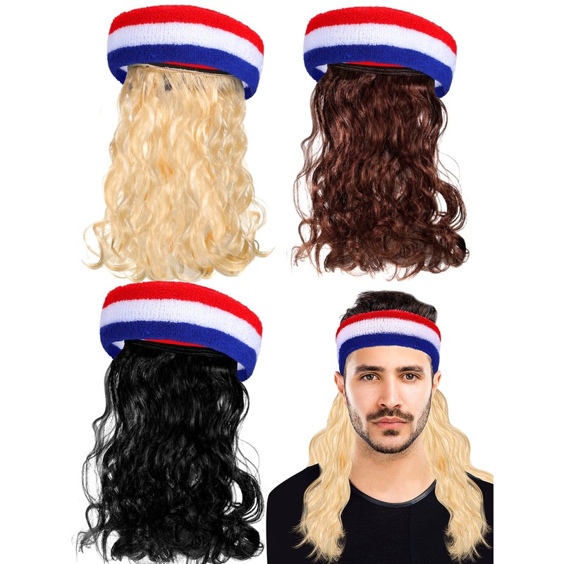 Giegxin 3 Pcs Mullet Wig for Men 4th of July Headband Patriotic USA Headband Red White and Blue Accessories Independence Day Wigs American Flag Sports Striped Sweatbands, Blonde, Brown, Black