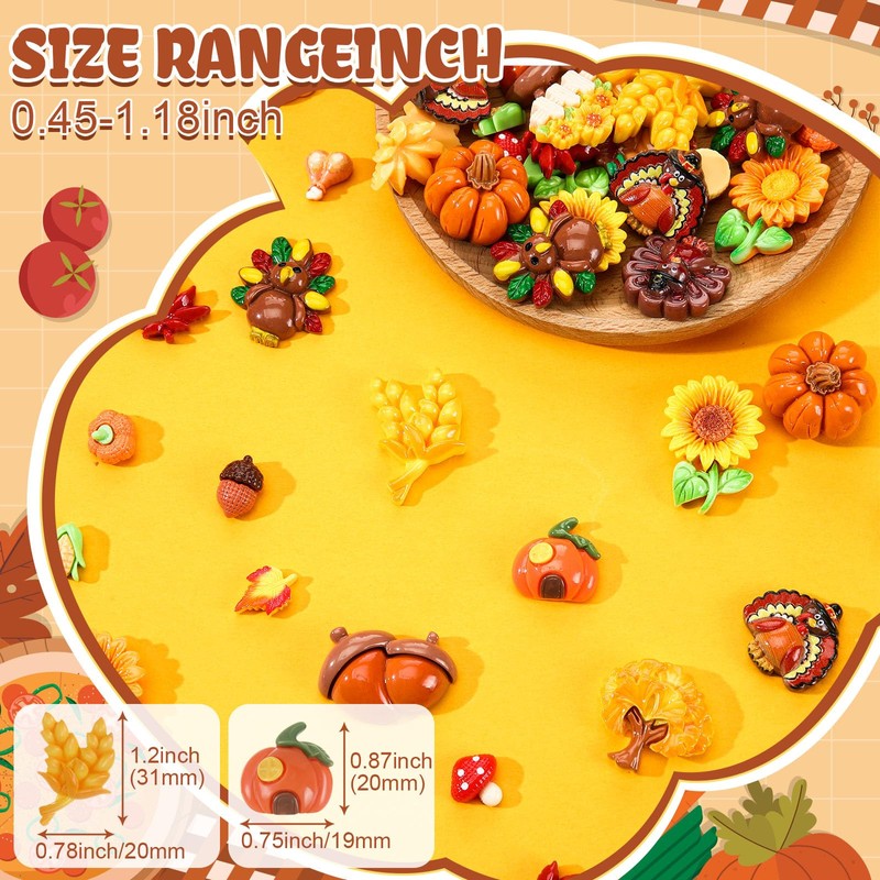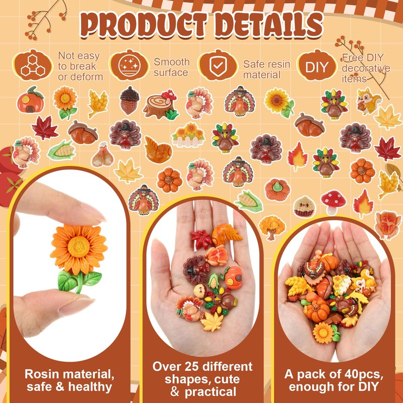 - Autumn Resin: these Thanksgiving Day accessories are so cute! You will get 40 pcs autumn resin accessories; Our Thanksgiving Day theme resin accessories include turkey, maple leaf, pumpkin, acorn, sunflower, corn, wheat and other autumn elements; These cute accessories have a strong Thanksgiving Day atmosphere and are very suitable for Thanksgiving Day DIY crafts