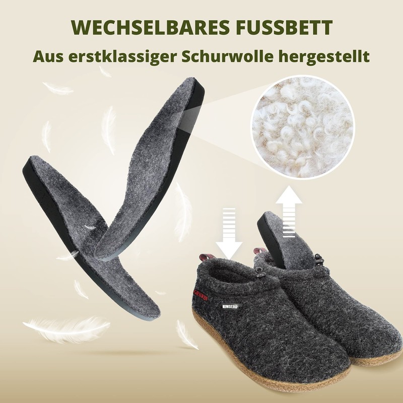 - 100% virgin wool: These slippers are made from pure virgin wool, which is cuddly soft thanks to 3D knitting technology. The breathable material provides pleasantly warm, dry feet. The footbed is interchangeable and can be easily exchanged for orthopaedic insoles.
