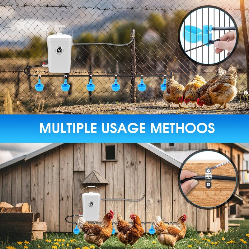 - PERFECT FOR ANY CHICKEN SETUP-: Whether in a coop or free-range, indoors or out, with wire or wood fences, this versatile automatic chicken water fits your needs. For easy elevation, just add support legs—no need for bricks. Prefer hanging? Adjust the height to fit your flock. No tap nearby? No problem! Connect the automatic waterer for chickens to a garden hose or even a rain barrel for easy water access.