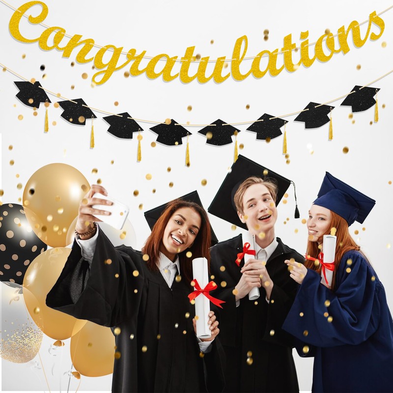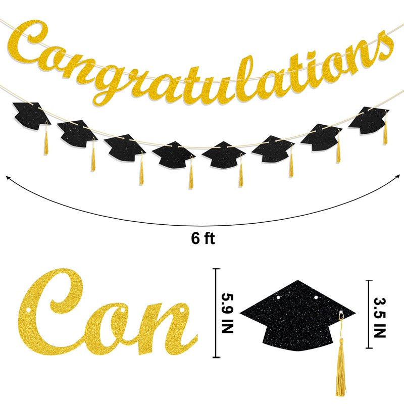 - 2025 Graduation Decor- This black and gold glitter congratulations banner adds the perfect touch to your graduation party. You can easily add them to mantels, banisters, windows, dessert tables, or even use as a photo backdrop