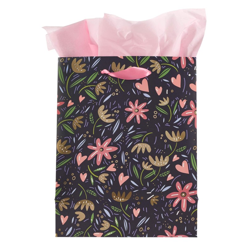 - BEAUTIFUL BLUE GIFT BAG: Small tulip blooms, leaves, and hearts are scattered in a fun random pattern with a verse phrase from Ecclesiastes 3:11 He Has Made Everything Beautiful In Its Time. Metallic gold foil design accents.