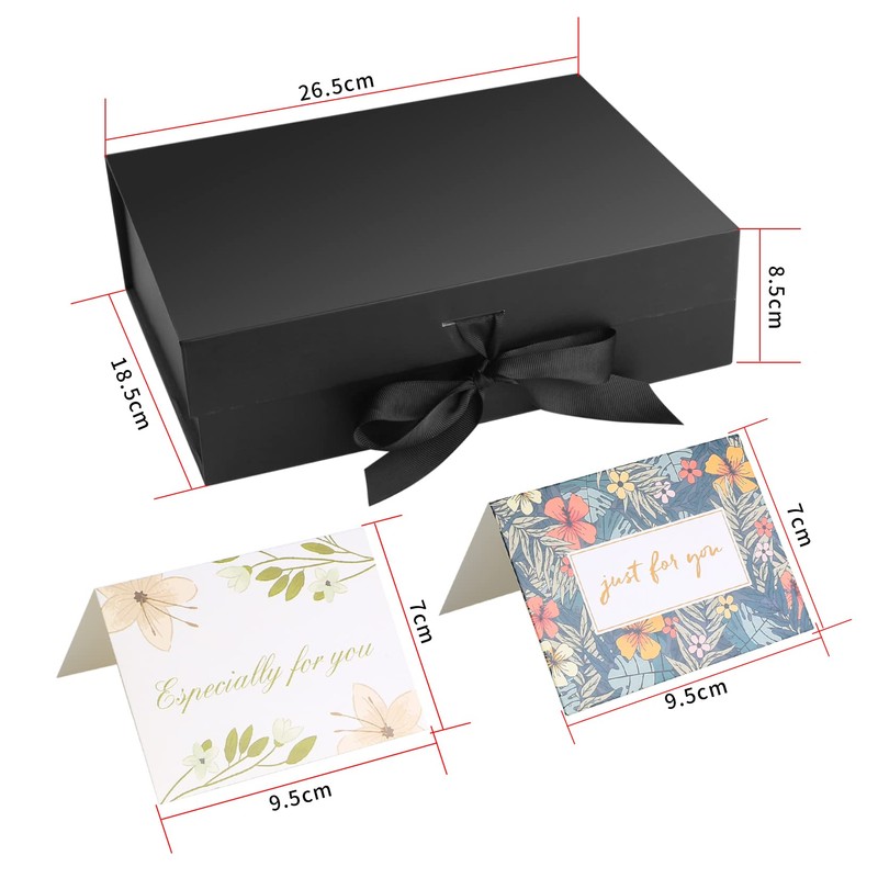 - What you get: you will receive 1 x gift boxes for gifts with ribbons in the size of 26.5 x 18.5 x 8.5 cm / 10.43 x 7.3 x 3.35 inches, 50 g black paper chips and 2 pieces cards. It is recommended that you measure the size of the gift first in case our gift box does not fit.