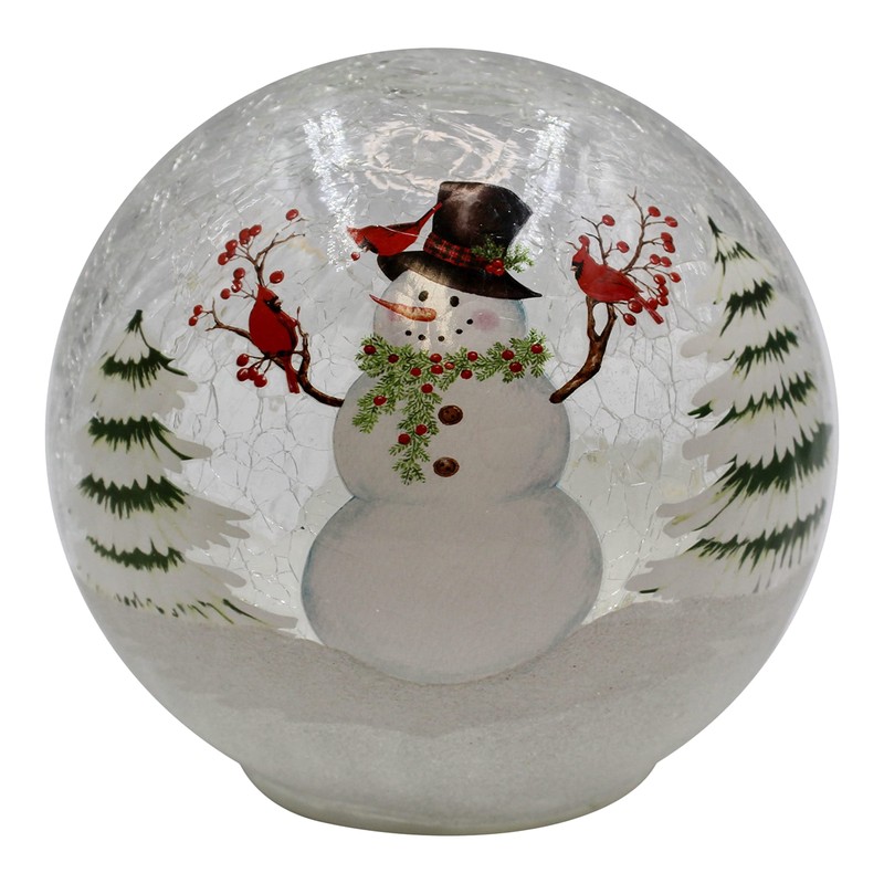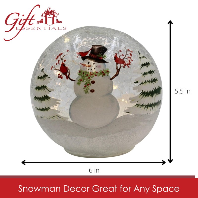 - Gift Essentials Lighted Snowman with Cardinals Glass Orb is the Perfect Winter Decor for All Year Round. This Battery Operated Crackled Glass Globe Measures About 6 inches Diameter x 5.5 Inches High.