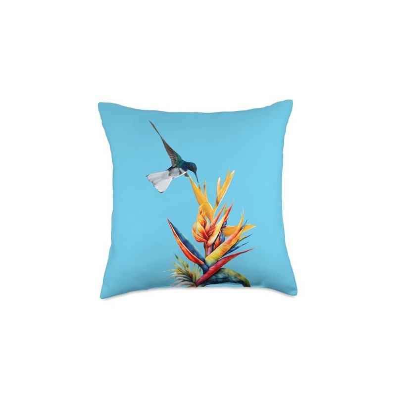 Gift Idea for Birders and Bird Lovers Hummingbird Feeding on Tropical Bird of Paradise Throw Pillow, 18x18, Multicolor