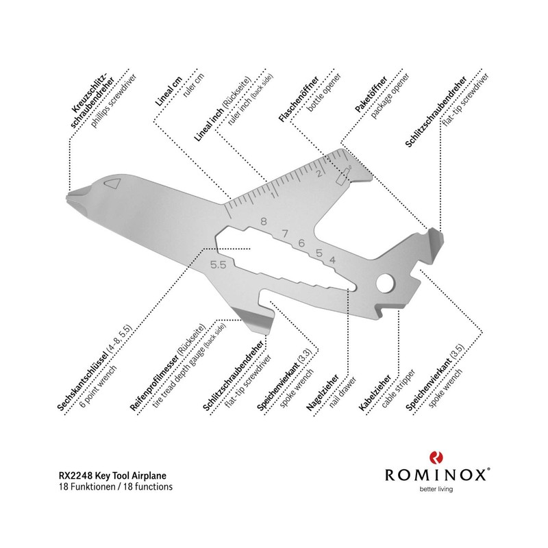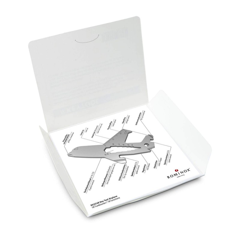 Gift Item: Rominox Key Tool/Aeroplane, 18 Functions, Keytool Key Ring Aeroplane/Pilot, Stainless Steel Multitool with Function Description, Multifunctional Tool for Travelling or Holiday