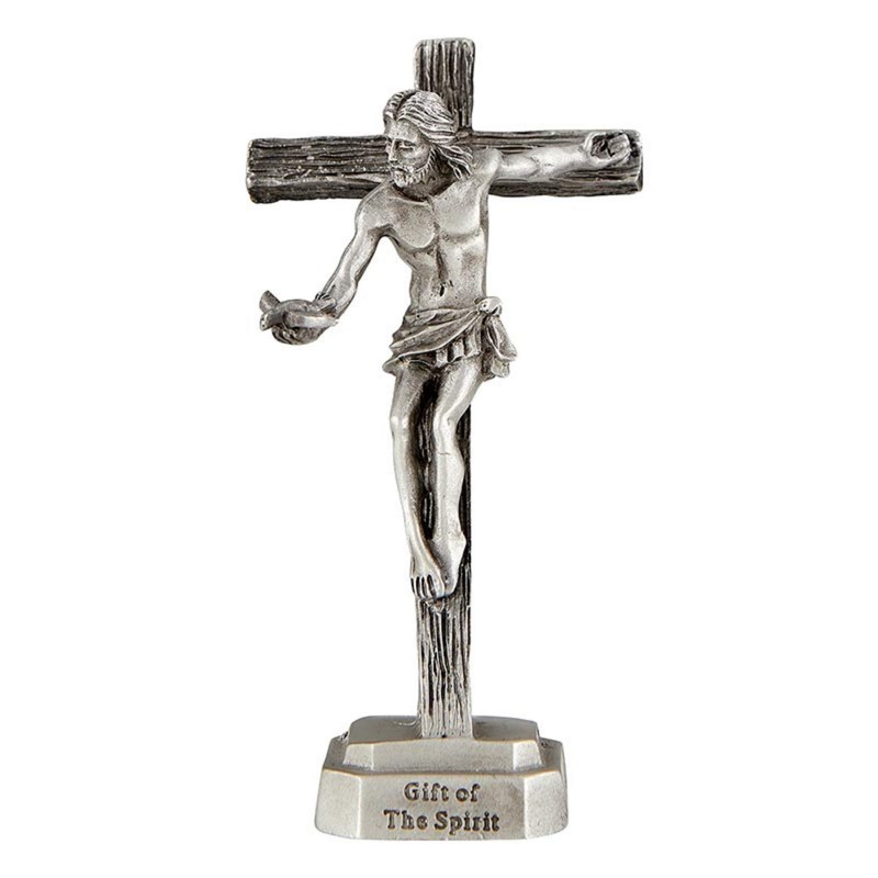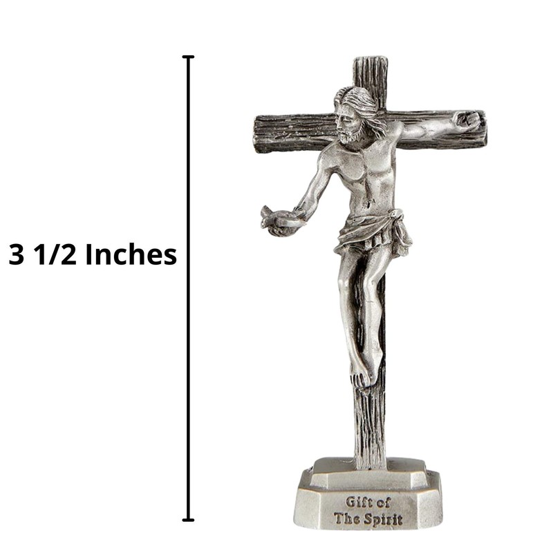 - El crucifijo cuenta con peltre Jesucristo sosteniendo paloma del Espíritu Santo con regalo del Espíritu Grabado en la base del crucifijo