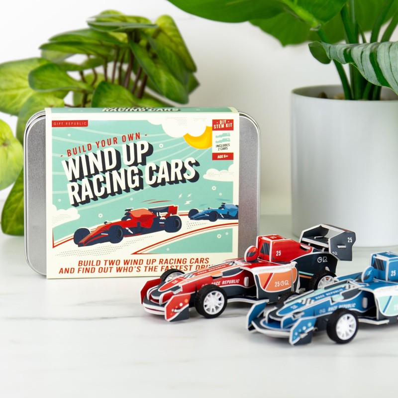 Gift Republic Build Your Own Wind-Up Race Cars Kit STEM DIY Set for Kids with 2 Foamboard Cars and Wind-Up Mechanisms – Fun Educational Activity for Ages 6+