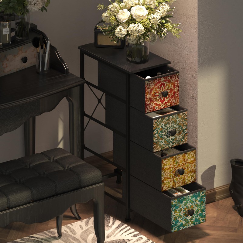 GiftGo Skinny Slim Dresser with Fabric Drawers Thin Boho Mandala Flower Chest of Drawers Narrow Storage Tower for Small Spaces Gaps Bedroom Beautiful Nightstand Living Room Table