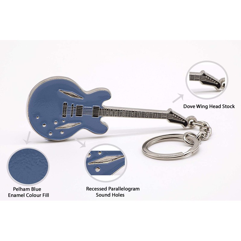 - Fantastic detail includes pelham blue enamel colour on the guitar body, black enamel colour on the finger board, headstock, humbuckers and bridge. Recessed stretched parallelogram sound holes, fret inlays
