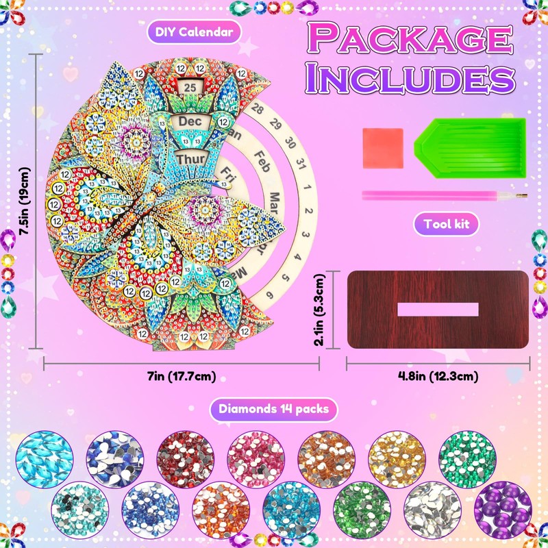 - 🍁【Diamond Calendar Mosaic Craft Kits for Kids】Our Diamond Calendar Kits has two series: Mandala / Butterfly, including a diamond art calendar and a set of diamond painting accessories. Creating a diamond calendar is not only fun but also helps develop kids' patience and focus, enhancing their artistic appreciation , aid in relaxation and stress relief. The charming diamond art pairs with the calendar, perfect as birthday gifts, creative craft toys, moving gift, christmas crafts for kids, etc