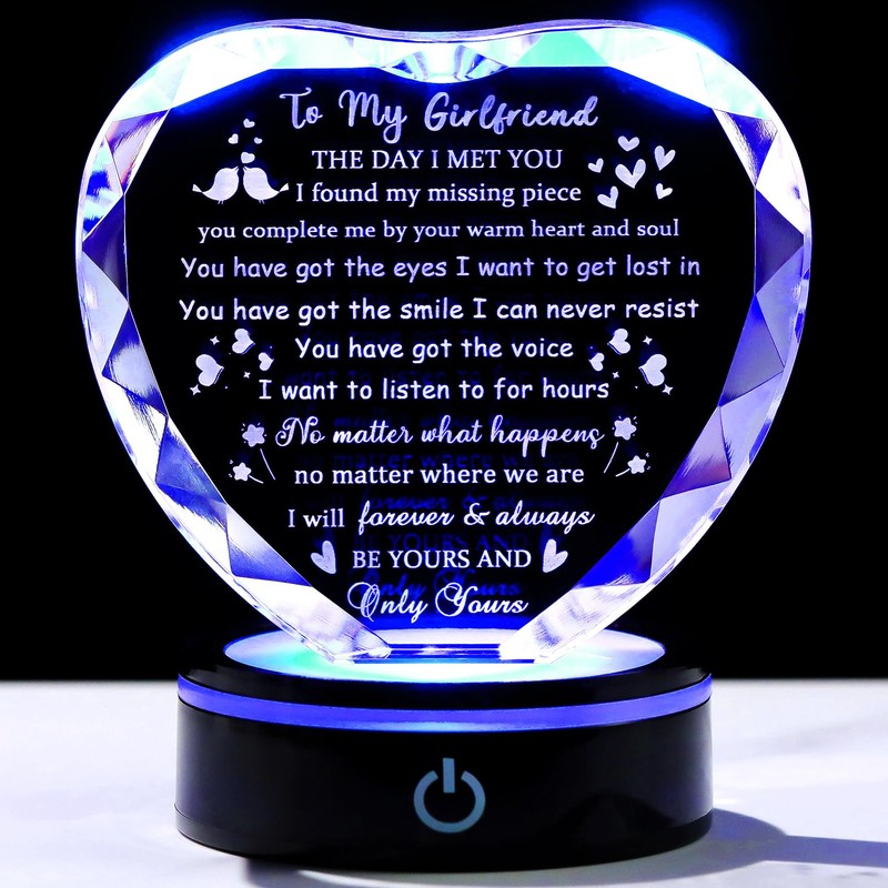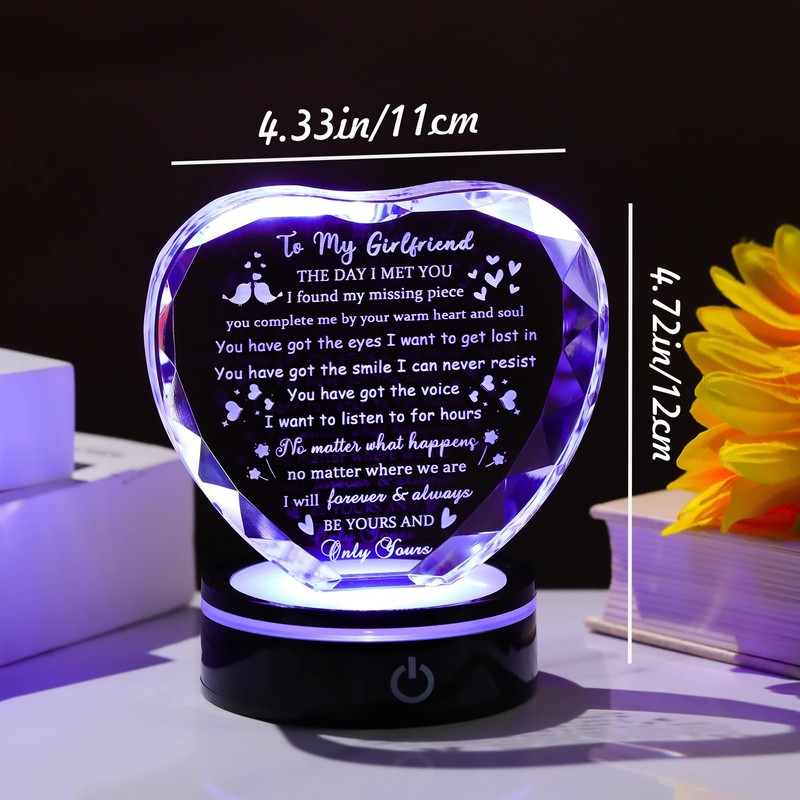 - Reliable Material & Craft: This girlfriend gifts from boyfriend is made of K9 crystal, transparent and more shiny, can be used for a long time without tarnish. All the patterns and texts are laser engraved inside the crystal. Not easily worn or faded. The light of the light base can change color automatically or fix the color, which can make the text clearer. Size: 4.33*4.72in/11*12cm; Nw: 1.24lb