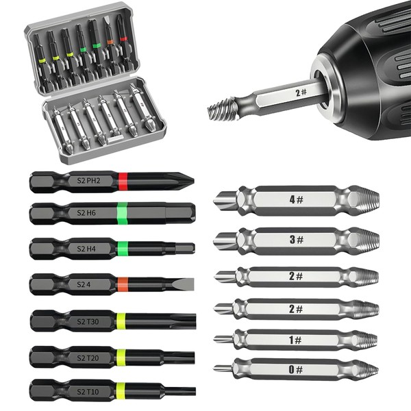 • Versatile Damaged Screw Extractor Set: Features 6 double-headed extractors (#0, #1, #2, #2, #3, #4) and 7 common screwdriver bits (T30, T20, T10, H6, H4, PH2, SL4), compatible with screws and bolts from 3-14mm, making it ideal for any project and repairs