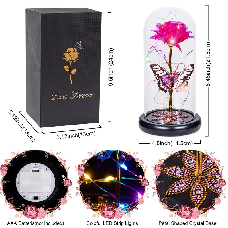 - 🦋🎁【Unique Valentines Day Gifts for Her】: Forever Glass Rose with Butterfly & Crystals Base: Plated with a 3" extra-large rainbow galaxy rose, one unique butterfly, and 4 shiny Petal-shaped crystal on a black plastic base. The glass rose is wrapped around an LED Strip tree lamp, Powered by 3 AAA batteries(not included). Just turn on the bottom switch, and it will glow warm light that can make your mom, wife, girlfriend or Grandmother's heart feel pleasure on Valentines Day, Birthday, Anniversary.