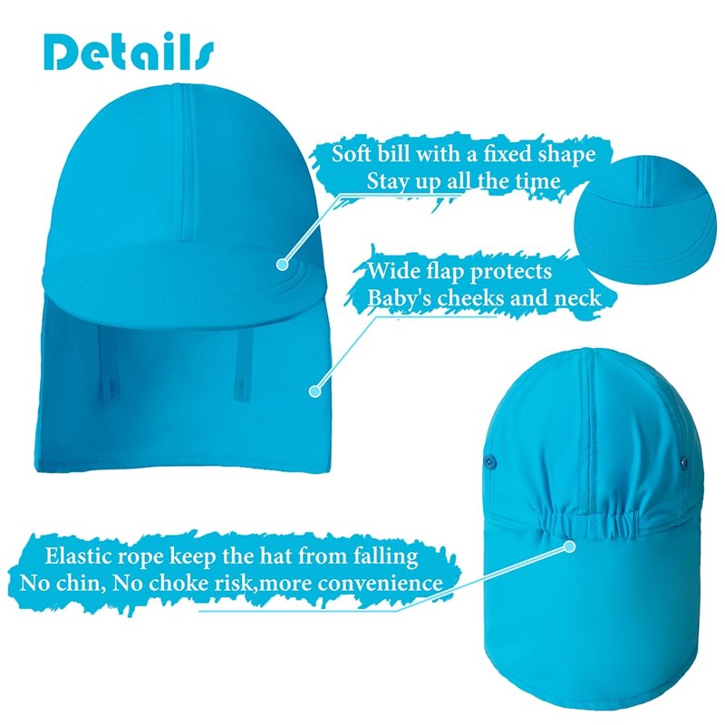 - 💦 VISOR and NECK FLAP: These sun hats are specifically designed for sun protection. Our protective sun hat featuring baseball cap's wide brim and neck flap to shield your child's face, ears and neck from the harmful rays of the sun