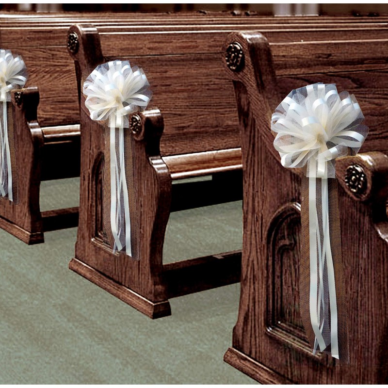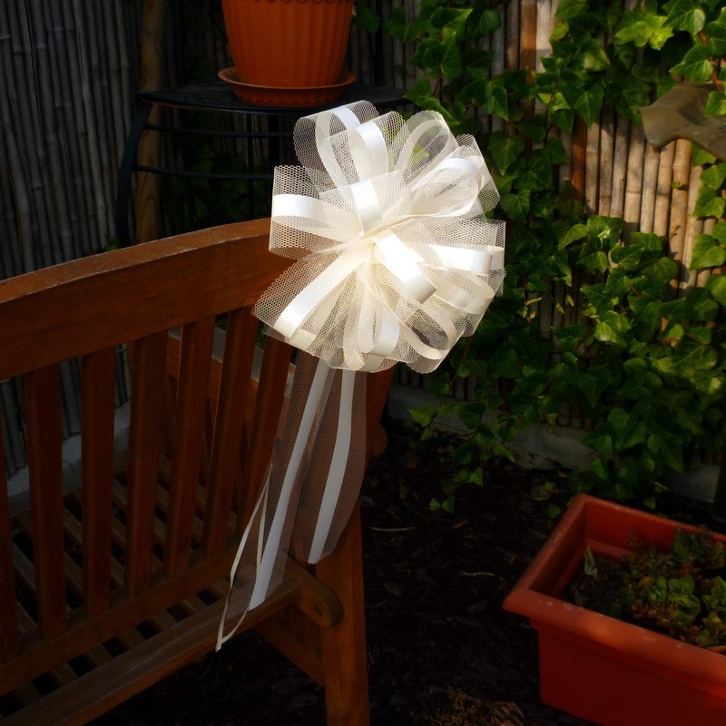 - Line the aisle at your indoor or outdoor wedding ceremony with these beautiful 9” wide fully assembled ivory tulle pew bows