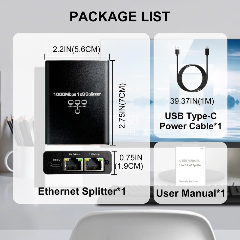 - Note: This Gigabit Ethernet Splitter It equipped with a 1 m USB charging cable, can support charging. Cannot be used without power connection. Two female ports are concurrently usable