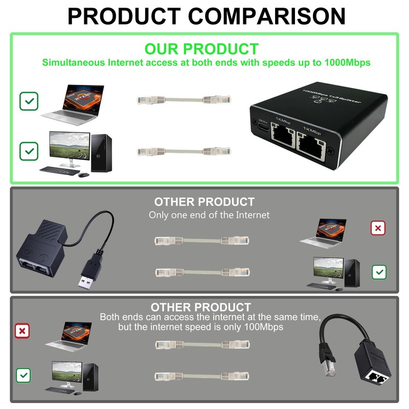 - Durable and Good Material: Internet Cable Splitter built-in thick environmental protection PCB circuit board, Aluminum alloy shell, RJ45 eight-core standard jack, gold-plated pin core, integrated mechanical welding, more stable transmission signal, it is more convenient to design closed insulation module and safer to use