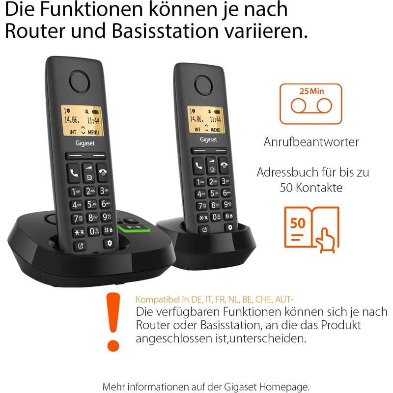 - Reliable and versatile – the Gigaset Pure 120A Duo impresses with an illuminated display – menu navigation with up to 26 languages available – internal conversations are possible when operating multiple handsets and triple conferences. Compatible in DE, IT, FR, NL, BE, CHE, AUT - More information on the Gigaset homepage.