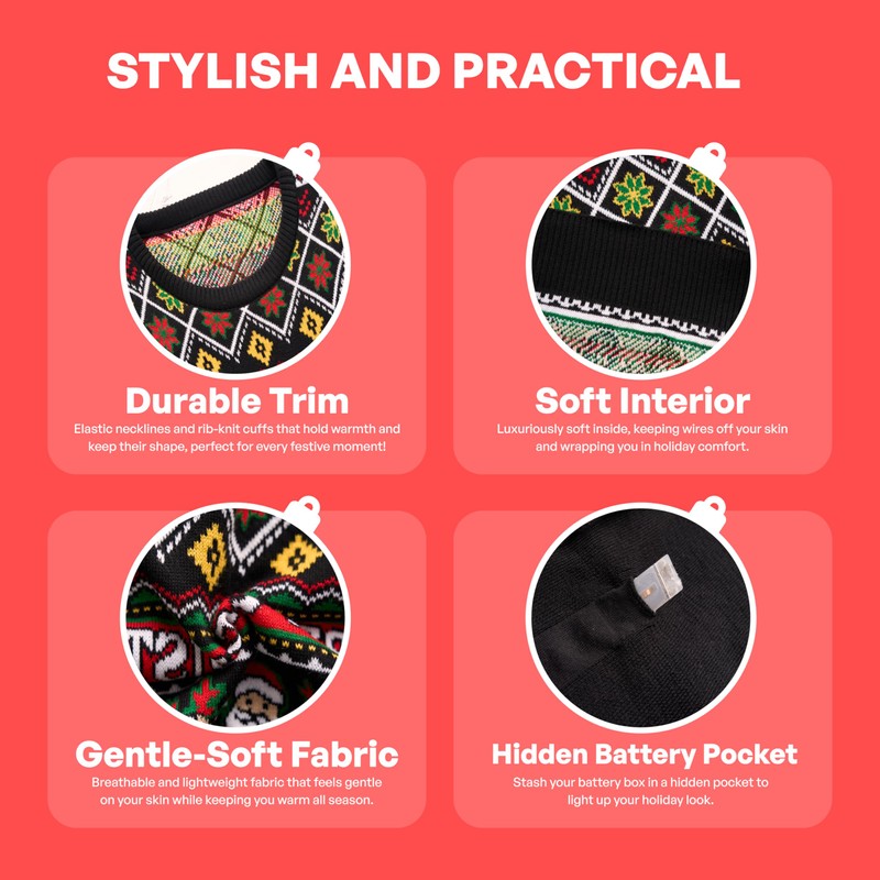 - High-Quality Material and Exquisite Craftsmanship: These ugly xmas sweaters for men are crafted from premium acrylic that are comfortable, stretchy, soft, and warm. The exquisite craftsmanship ensures that these funny christmas sweaters for men maintain their appearance well. The thoughtful light button pocket design allows for easy access to the light button while in use.
