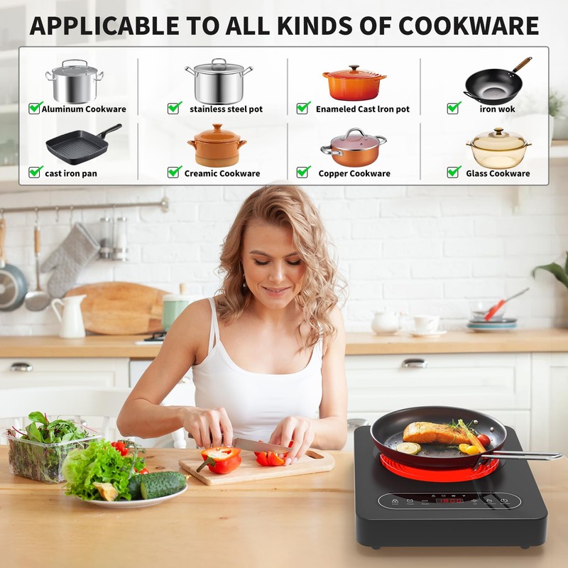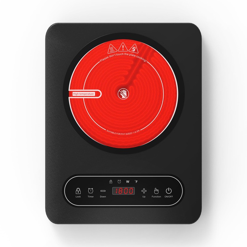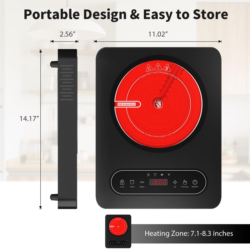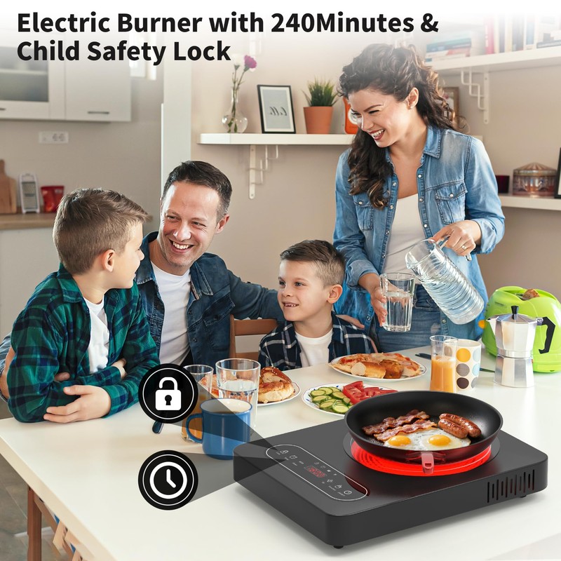 - Safe & Versatile:This Electric stove top can be timed independently with digital timer to adjust the temperature, power, cooking mode. Portable cooktop this way you can manage your cooking time efficiently and do other things without worry. single Electric burner has multiple safety protection such as child safety lock,overheating protection, Double ring heating and residual heat warning.