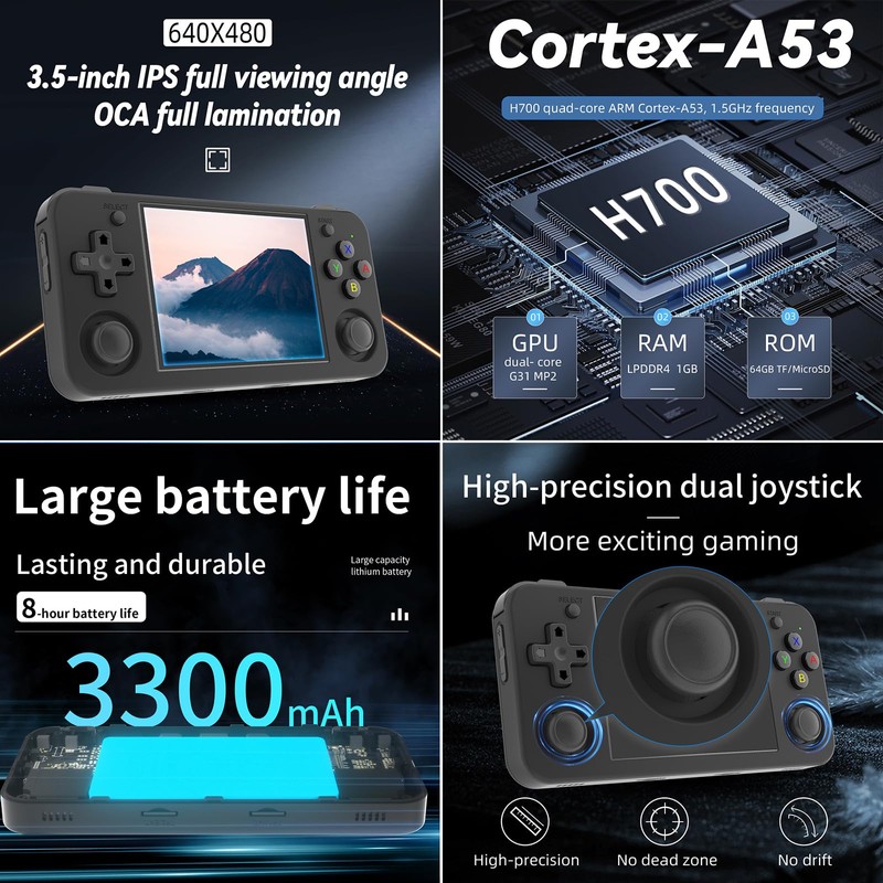 - Anbernic RG35XXH with Upgrade chipThis rg35xxh video game console uses H700 quad-core ARM Cortex-A53, 1.5GHz frequency , dual- core G31 MP2 which can solve the problem of frame dropping in the game, run the game perfectly, and make your game screen smoother.