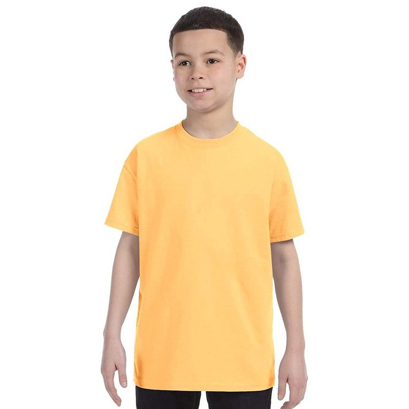 5000B Gildan Heavy Cotton™ Youth T-Shirt The classic cotton look and feel you love from a brand you trust… when it comes to T-shirts, it gets no better than that. preshrunk 100% cotton jersey knit (blended cotton/polyester in heather and neon and safety colors) 5.3 oz. seamless double-needle 3/4" collar taped neck and shoulders double-needle sleeve and bottom hems quarter-turned to eliminate center crease CPSIA tracking label compliant Sizes: XS-XL