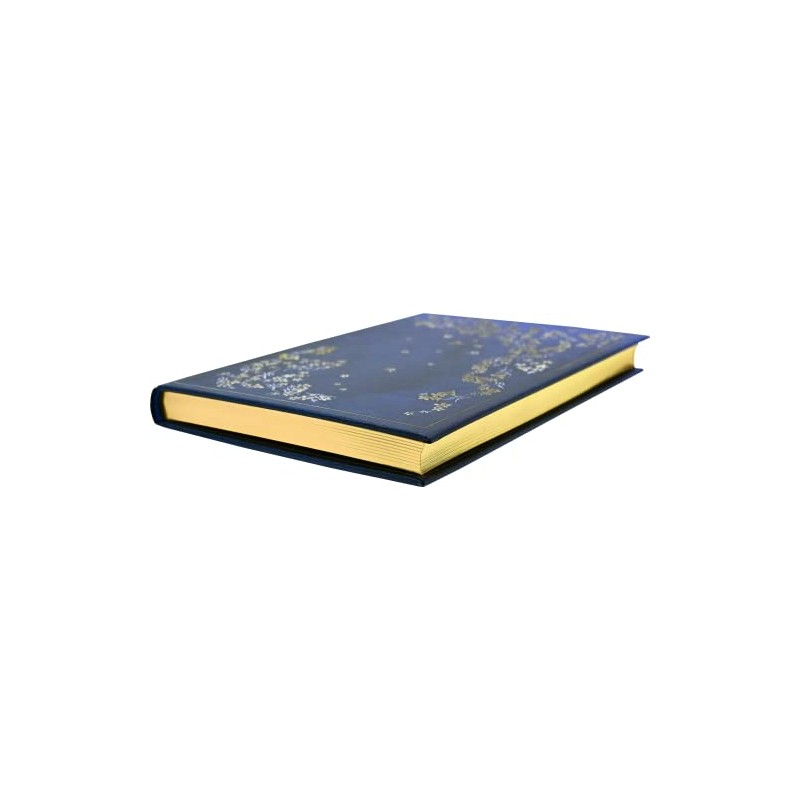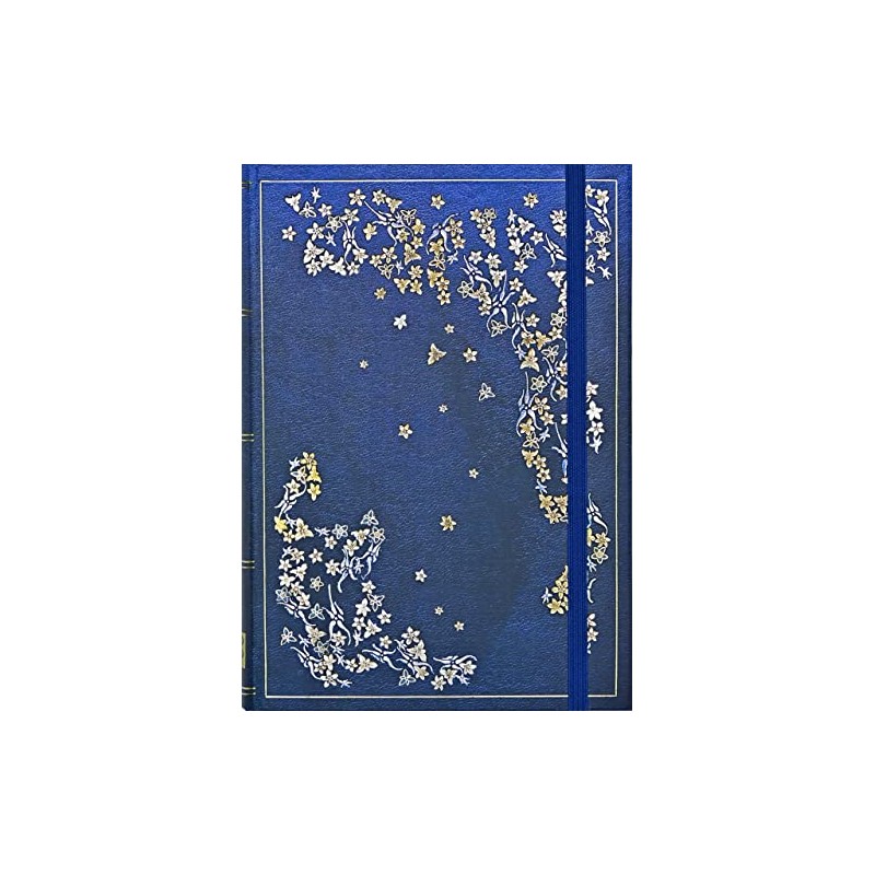 - The journal's deep blue covers are showered with gilded floral motifs.