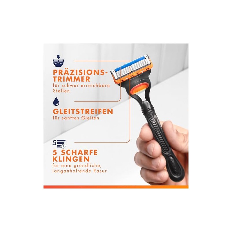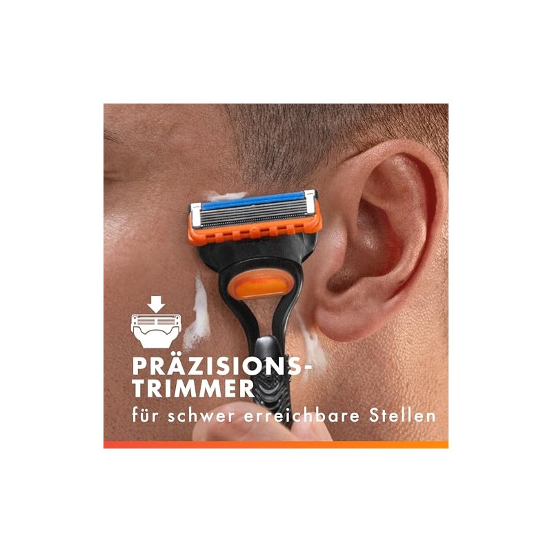 Erlebe eine unglaublich gründliche und komfortable Rasur mit den Gillette Fusion5 Ersatzklingen für Männer. Die Ersatzklingen verfügen über 5 scharfe Klingen, die für eine glatte und angenehme Rasur sorgen. Die Fusion5 Rasierklingen verfügen über einen größeren Gleitstreifen für ein sanfteres Gleiten (im Vergleich zum vorherigem Fusion5), was den Komfort Deines Rasurerlebnisses erhöht. Jede Ersatzklinge bietet bis zu 20 Rasuren (*basierend auf 3 Rasuren pro Woche). Die Klingen beinhalten auch einen Präzisionstrimmer für schwer erreichbare Stellen. Mit einem Microfin Guard, der die Haut vor der Rasur glättet, und einem Mikrokamm, der die Haare in Richtung der Klingen leitet, sorgt dieser Rasierer für ein effizientes Rasurerlebnis. Für optimale Ergebnisse kombinieren Sie es mit Gillette Fusion Pro Sensitive Cooling Gel.