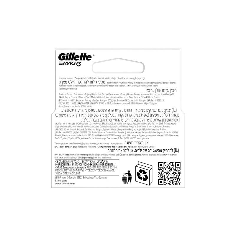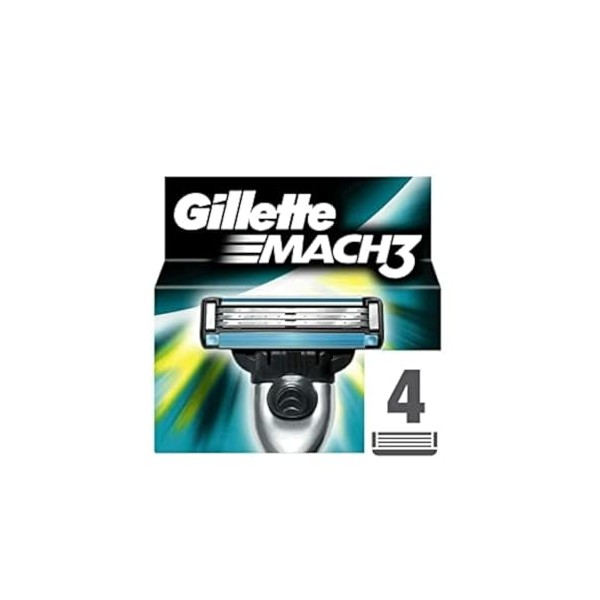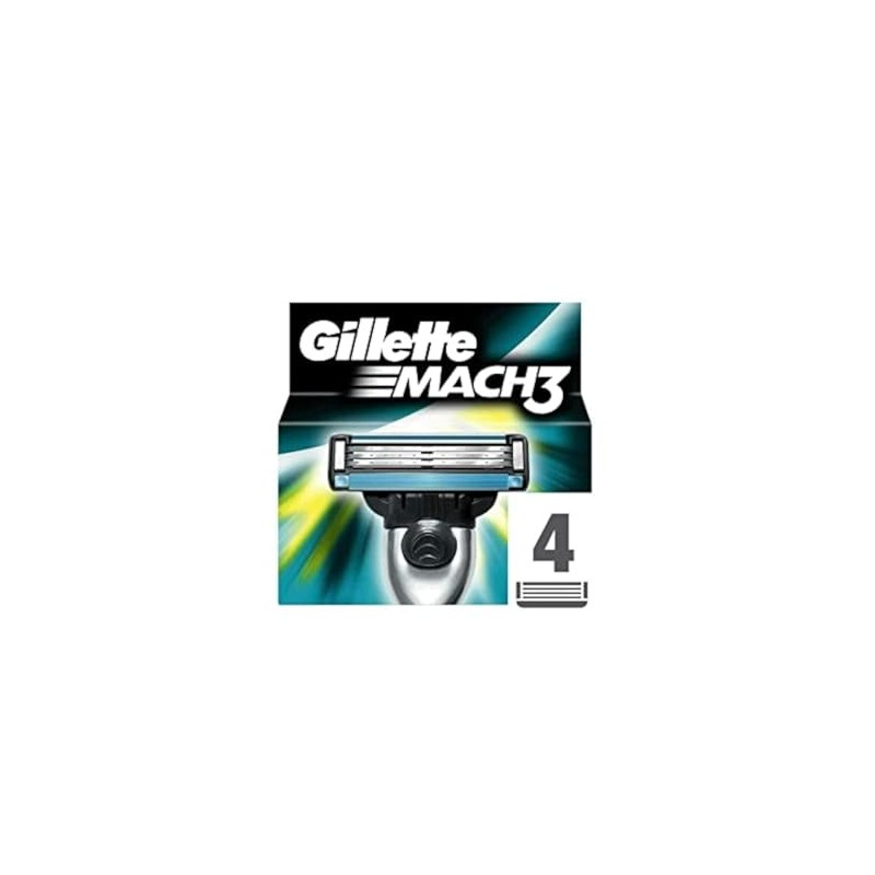 Product DescriptionThe Gillette Mach3 is a revolutionary new triple-blade shaving system for the closest shave ever in fewer strokes - with less irritation. Each cartridge has patented DLC comfort edges on the blades and the blue lubricating strip fades when time to replace. The open cartridge architecture is designed for easy rinsing.From skin and oral care to home appliances, Gillette products touch lives around the world every dayTriple-blade shave means less irritationPatented DLC comfort edgesOpen cartridge architecture for easy rinsingBlue lubricating strip fades when time to replace4 Gillette Mach3 refill cartridgesSet Contains:1 x Gillette Mach-3 4 Cartridge