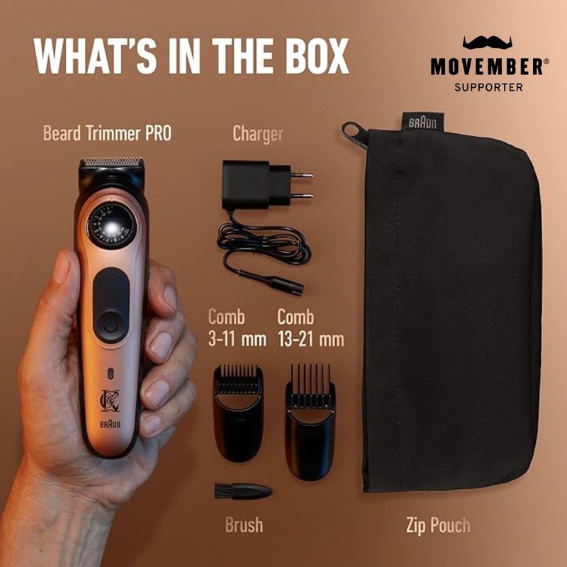King C. Gillette Beard Trimmer PRO takes versatility and precision in men's grooming to the next level with a precision wheel that comes with 40 length settings in precise 0.5mm. With this trimmer, you can style any beard, long or short, into any beard style of your choosing. The King C. Gillette Beard Trimmer PRO comes fully equipped with 1 trimmer, 2 combs, 1 brush, 1 charger and 1 zip pouch and is designed to make grooming easy, and quick. The King C. Gillette Beard Trimmer PRO cleans well under running water and the metal blades stay sharp for a lifetime. So with every wash, you can be assured of a blade as good as new. The cordless design on this personal groomer also elevates the experience, making a beard care something you look forward to, rather than shy away from. You can use your beard trimmer for up to one full month on a single full charge and get noticeably better facial hair that has a smooth, clean look. Our trimmers are designed with care and the best in men's grooming in mind. The King C. Gillette Beard Trimmer PRO is suitable for all beard types and shapes and still achieves the best results. So regardless of whether you have a stubble or long beard, this is the beard trimmer for you.